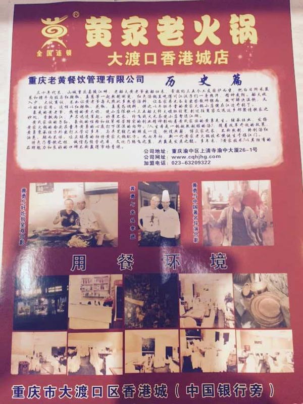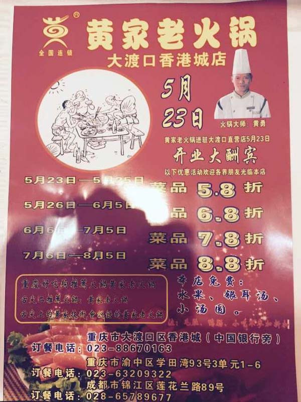 黄家老火锅大渡口直营店,5月23曰盛大开业。菜品23日一5月25日菜品5·8折。5月26曰一6月5曰菜品6·8折。6月6曰一7月5曰7·8折。7月8日一8月5曰8·8折优惠。欢迎各界朋友前来品尝,舌尖上的黄家技术,会说话的黄家老火锅,地址:重庆市大渡囗区香港城:中国银行旁边黄家老火锅,订餐电话:023一88671063